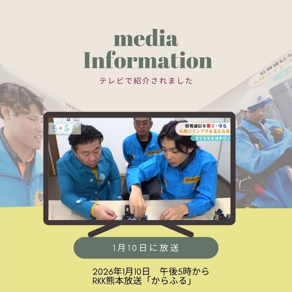 2026年01月14日 カテゴリー: お知らせ テレビで紹介されました RKK熊本放送「からふる」にて会社の事や若手社員の活躍を紹介していただきました。 インスタグラムでは、SYSKENテクノの最新情報を発信中です。 「いいね」「フォロー」をお待ちしております。